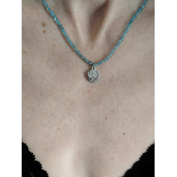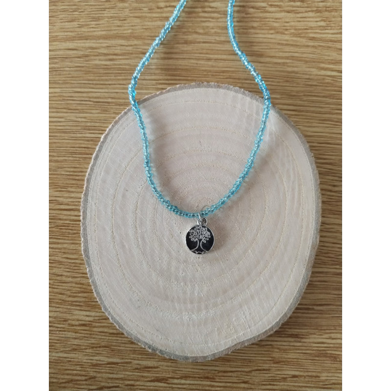 J’ai réalisé ce collier avec des petites perles translucides. Le médaillon représente un arbre de vie argenté, au recto et au verso.