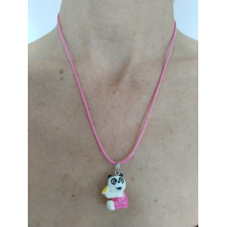 Il est monté sur un cordon en cuir de couleur rose qui mesure entre 42 cm et 46 cm, grâce à sa chaîne de rallonge.