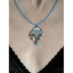 Le cordon est en cuir de couleur bleu ciel. Il mesure 46 cm de longueur.
