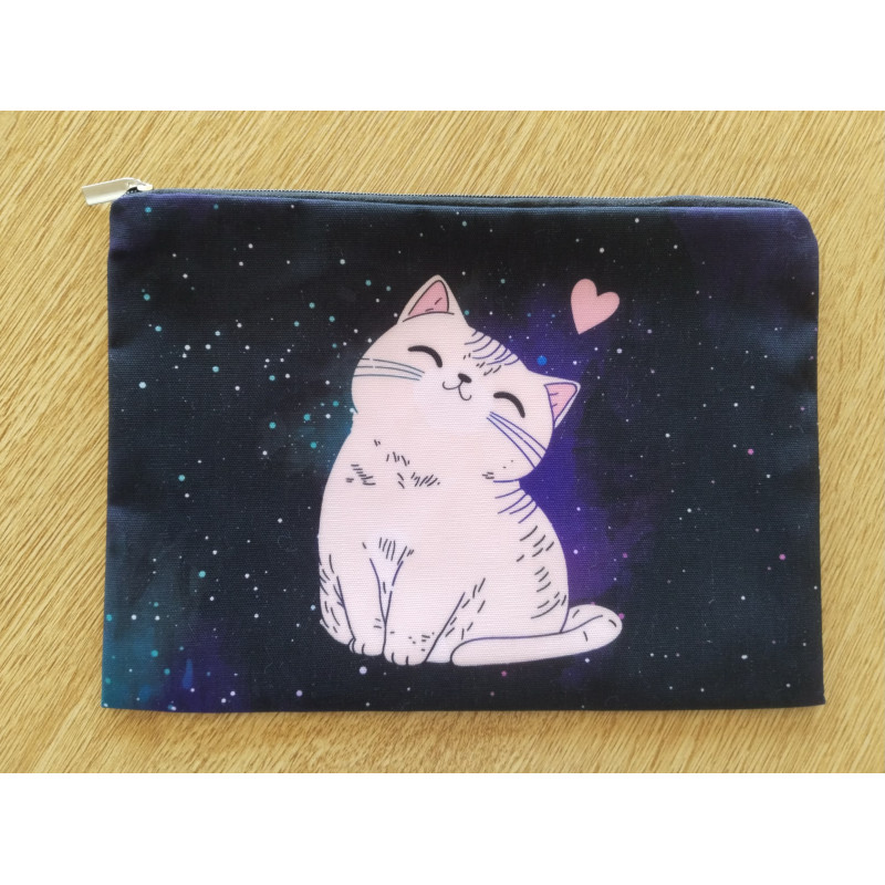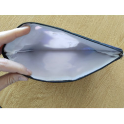 La pochette est zippée : elle mesure 23 cm de long et 17 cm de large.