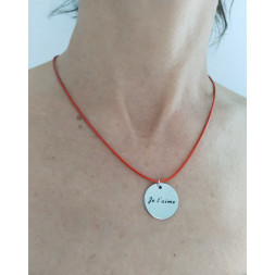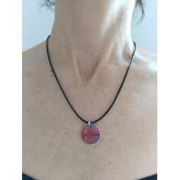 J’ai également créé ce collier avec un cordon de couleur rouge. D’autres colliers à message sont en ligne, comme sur les photos.