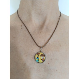 Le support du pendentif est en métal argenté, d’un diamètre de 2 cm.