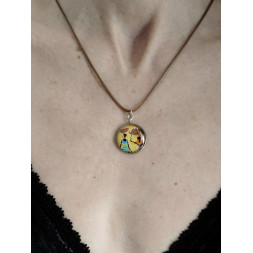Le support du pendentif est en métal argenté, d’un diamètre de 2 cm, recouvert de résine.