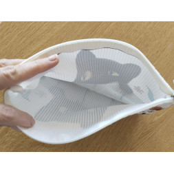 La pochette est zippée : elle mesure 26 cm de long et 16 cm de large.