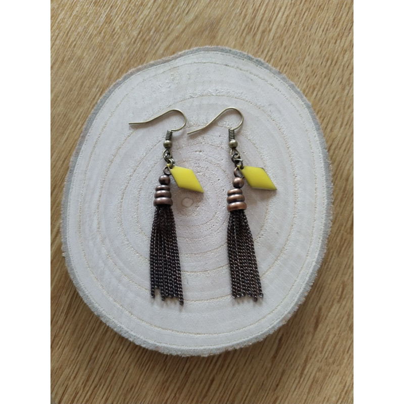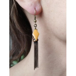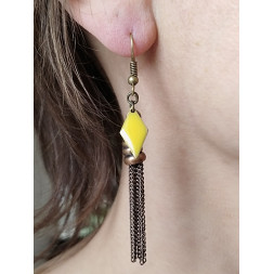 La fantaisie en pampille de couleur bronze est rare et originale. Le losange jaune donne tout son éclat à la boucle.